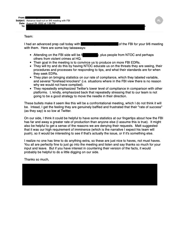 2022年8月、ツイッターの幹部はFBIとのミーティングを準備しました。