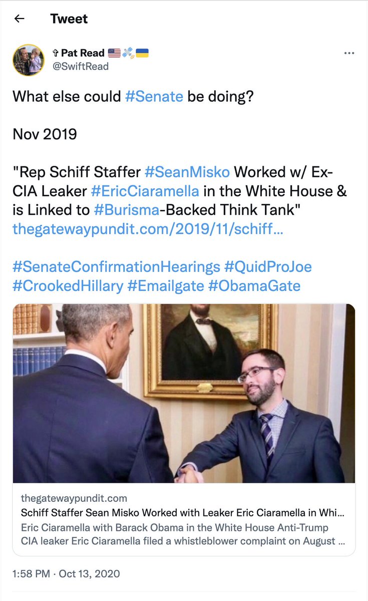 「上院は他に何をしているのだろう? 2019年11月 シフ議員スタッフのシーン・ミスコはホワイトハウスで元CIAの情報提供者であるエリック・キアラメラ と働いていた。