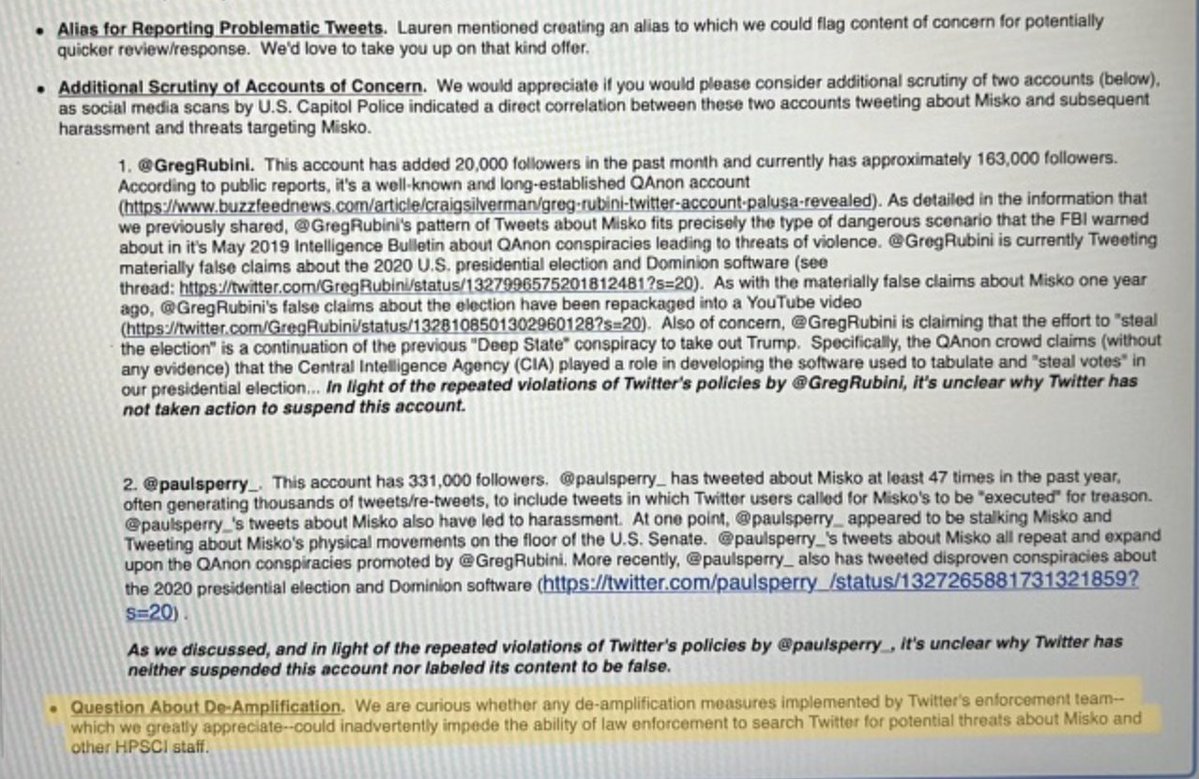 ツイッターはまた、シフ氏とそのスタッフに関するコンテンツの禁止、例えば 「ミスコ氏や他の委員会スタッフに関するあらゆる検索結果の完全な抑制」などの要求も拒否しています。